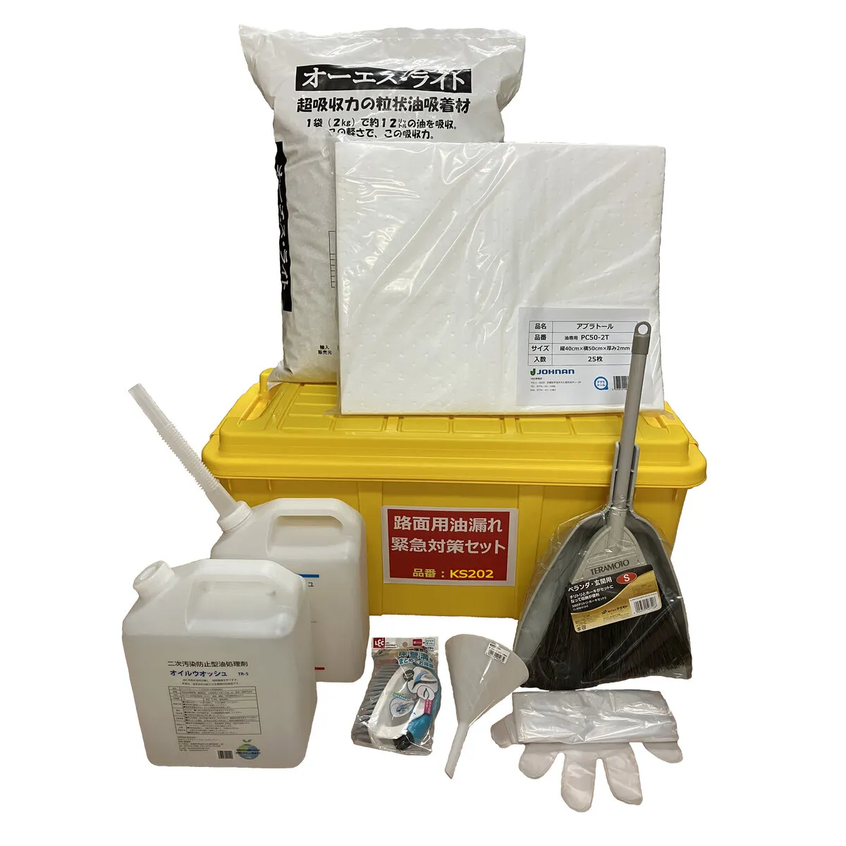 ●吸収材+粒状吸収材+油分離剤をセットにした路面・床面用油漏れ対策品です。